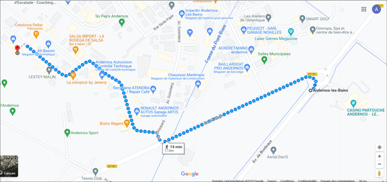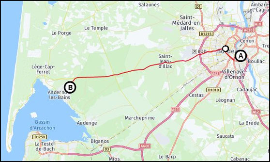 De -A- la gare SNCF Saint Jean de Bordeaux à -B- l’arrêt de car "rond point miami" d'Andernos-Les-Bains.